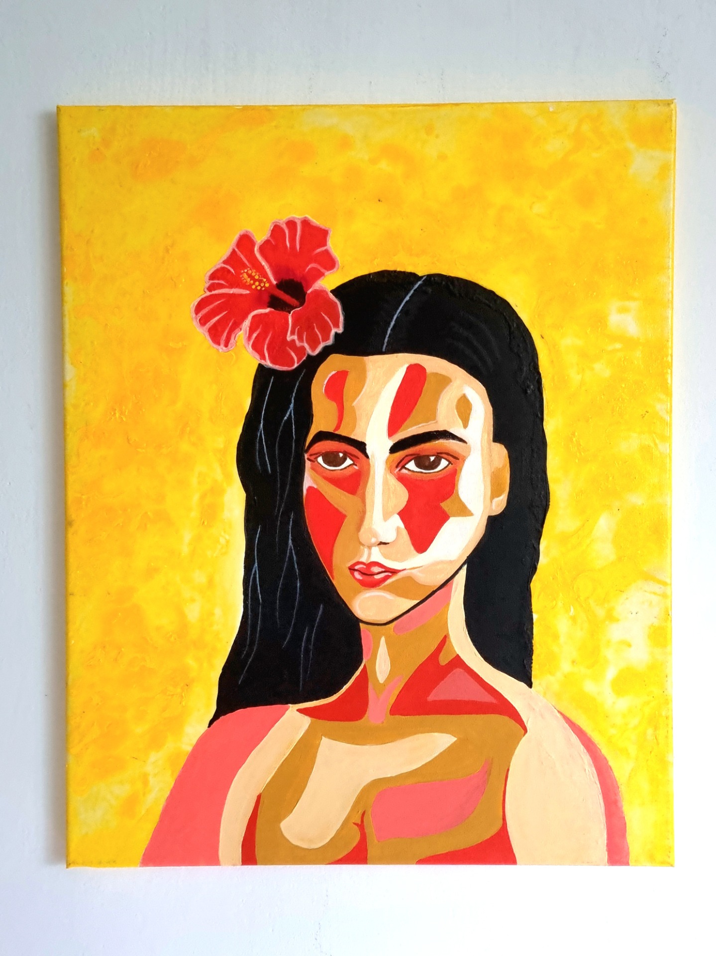 Hawaian" Akryl, plátno 40x30, 2022Jeden z mých prvních obrazů akrylem. Tady jsem také omylem objevila pouring a další pro mě významné prvky.
